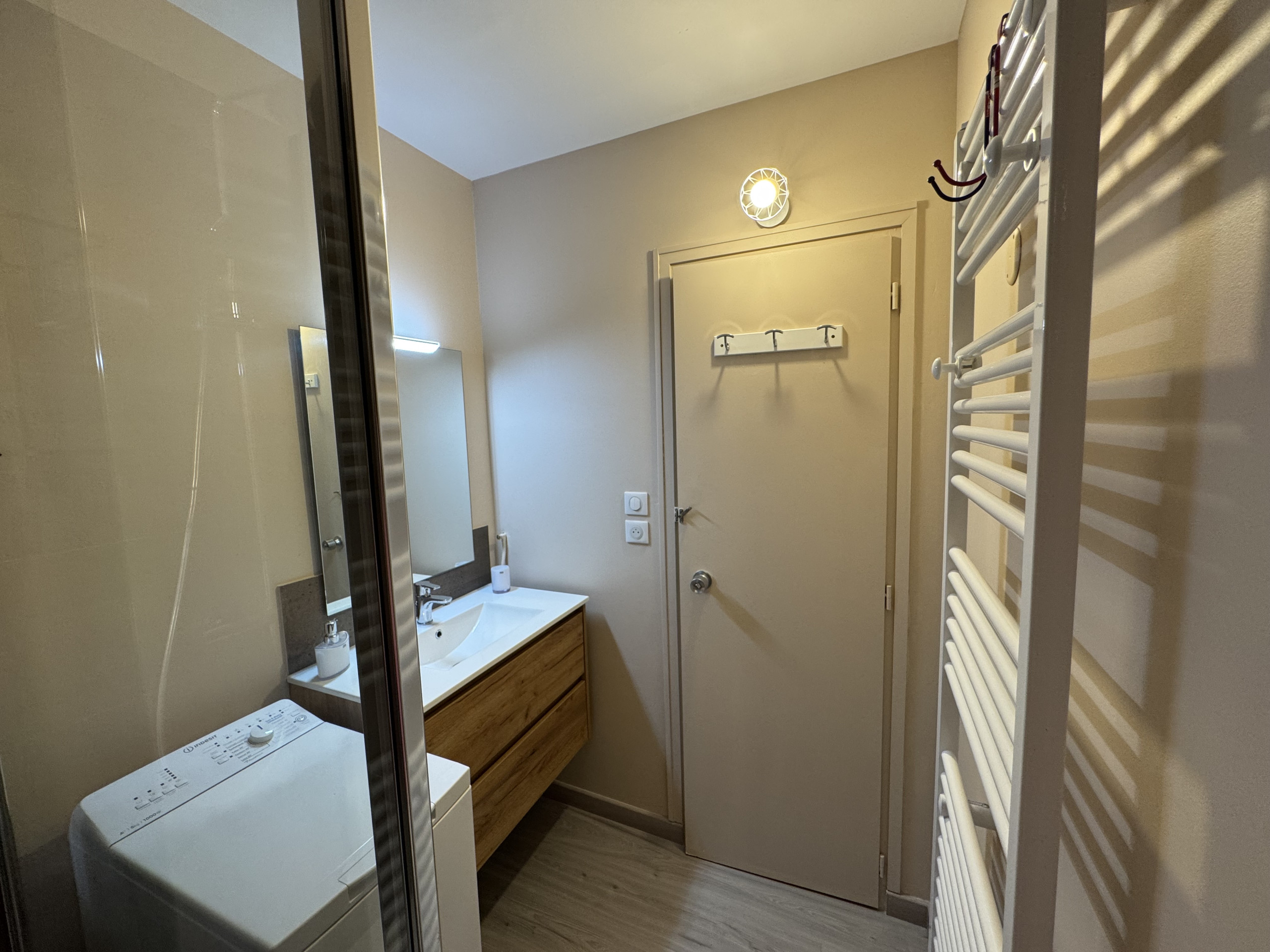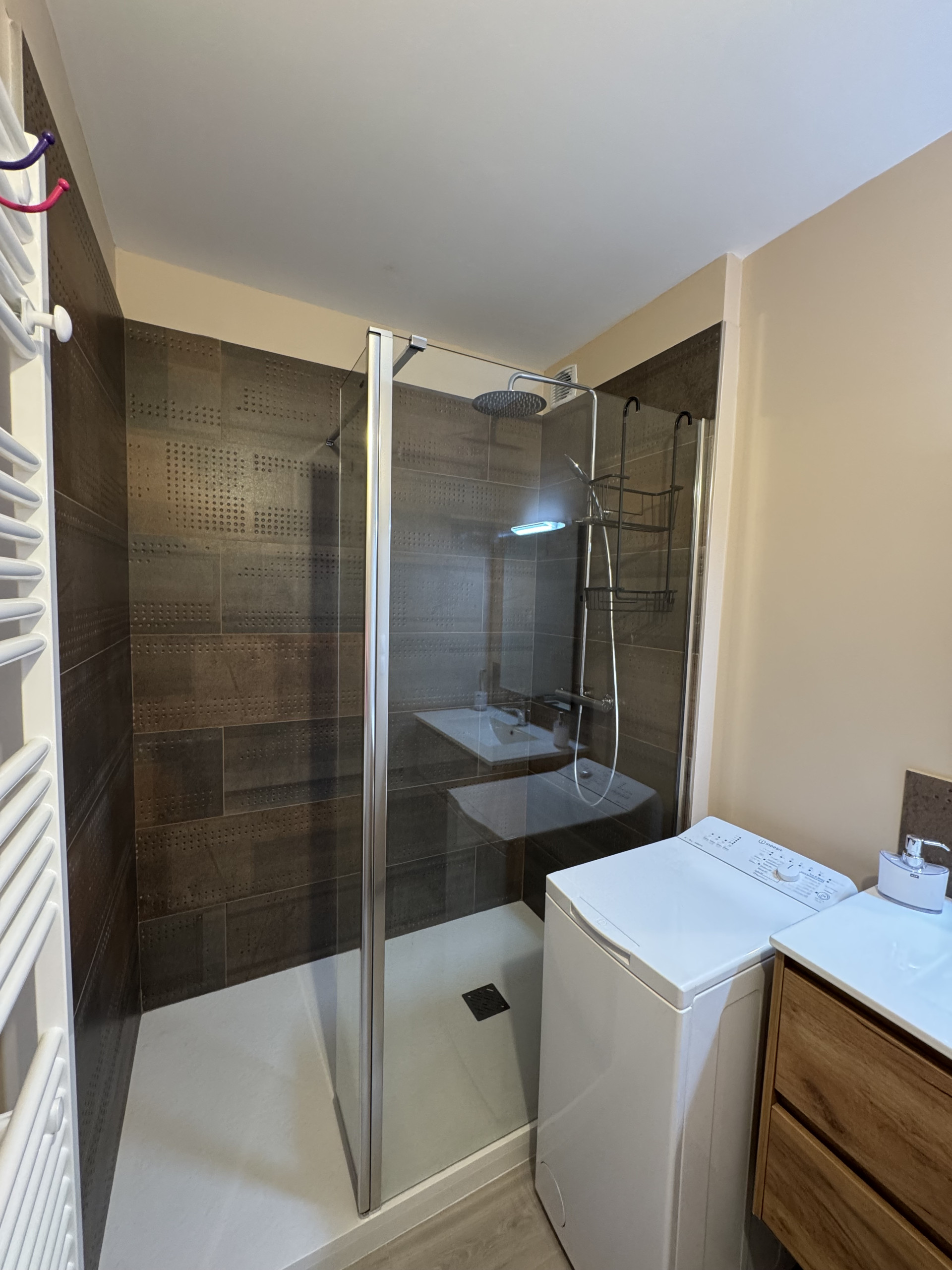 Salle d'eau : Entièrement rénovée avec une douche à l'italienne et une machine à laver.