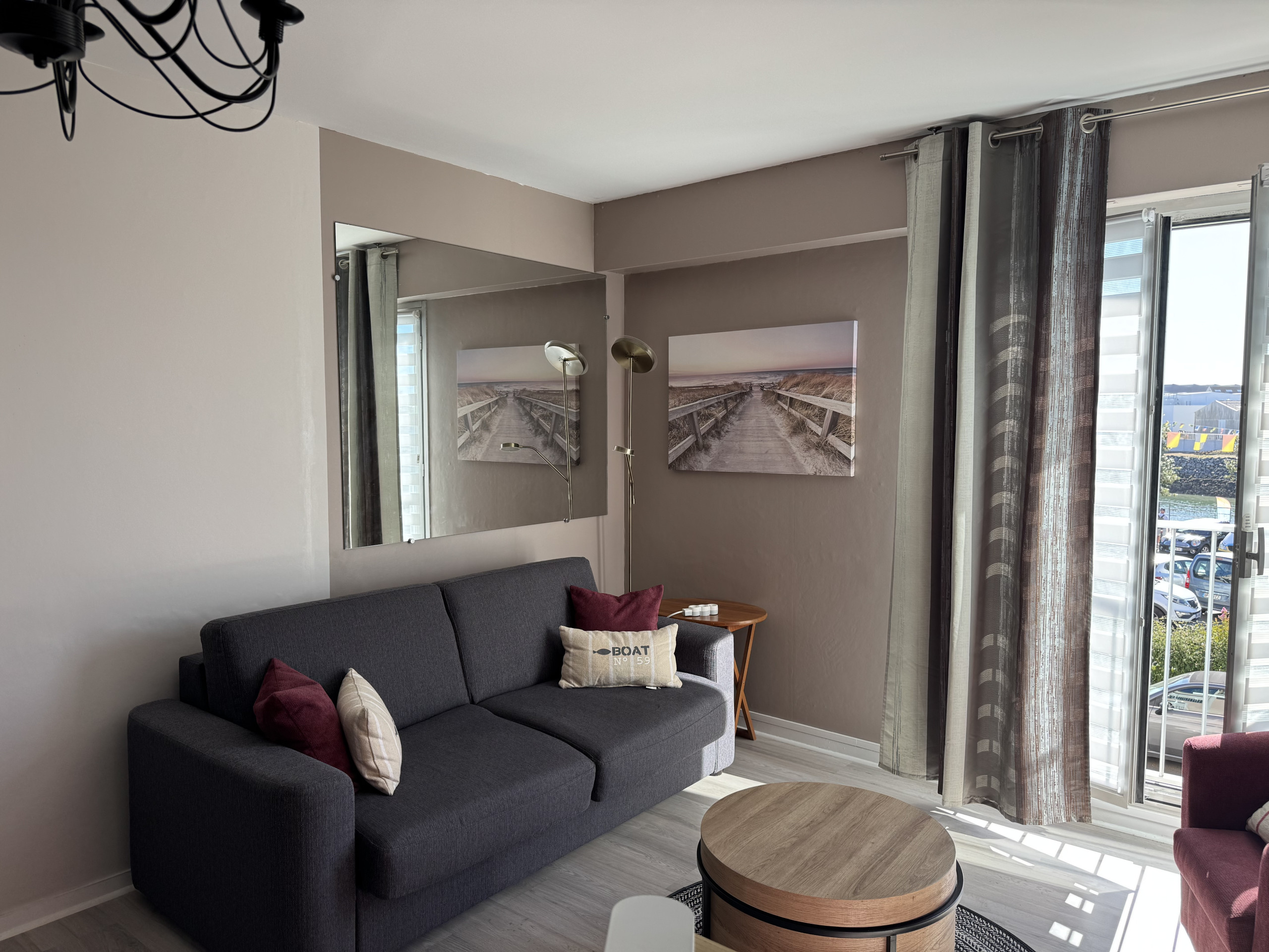 🛋 Salon-séjour avec canapé type BZ (140 cm) et accès au balcon face à la mer 🌊