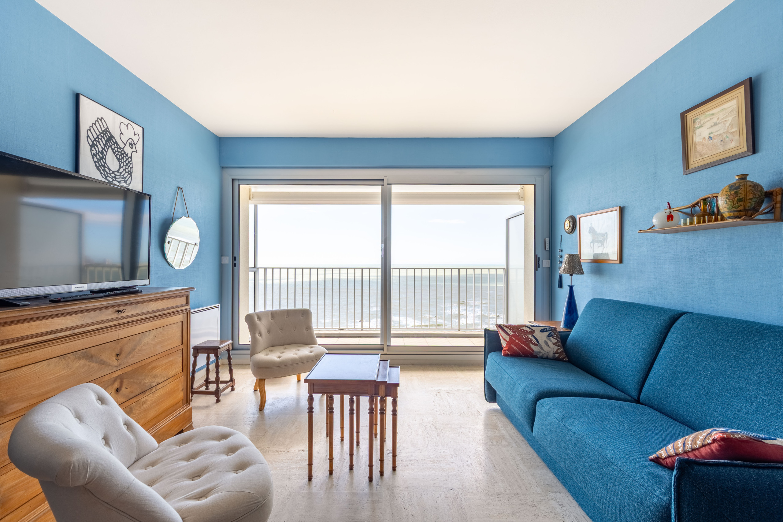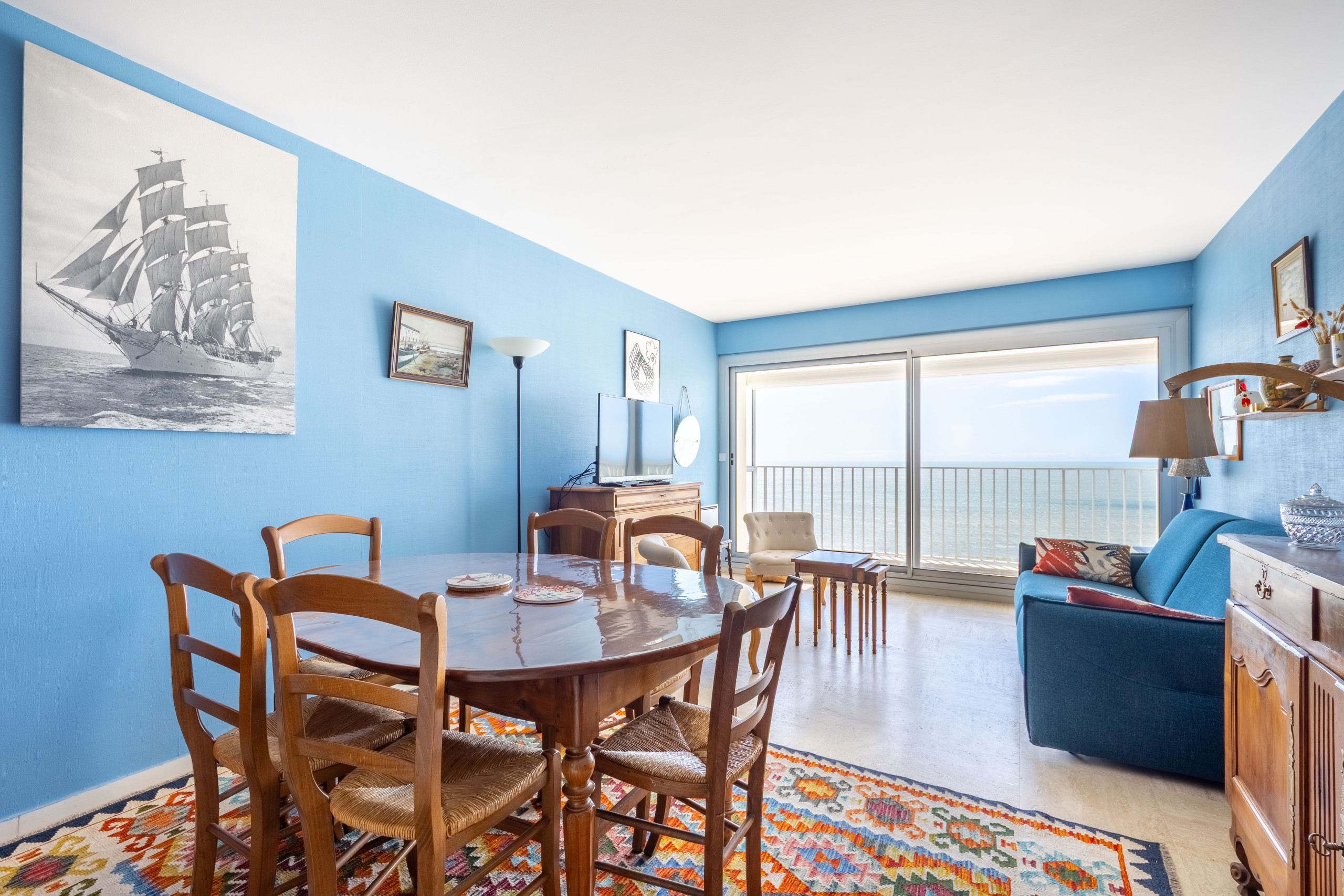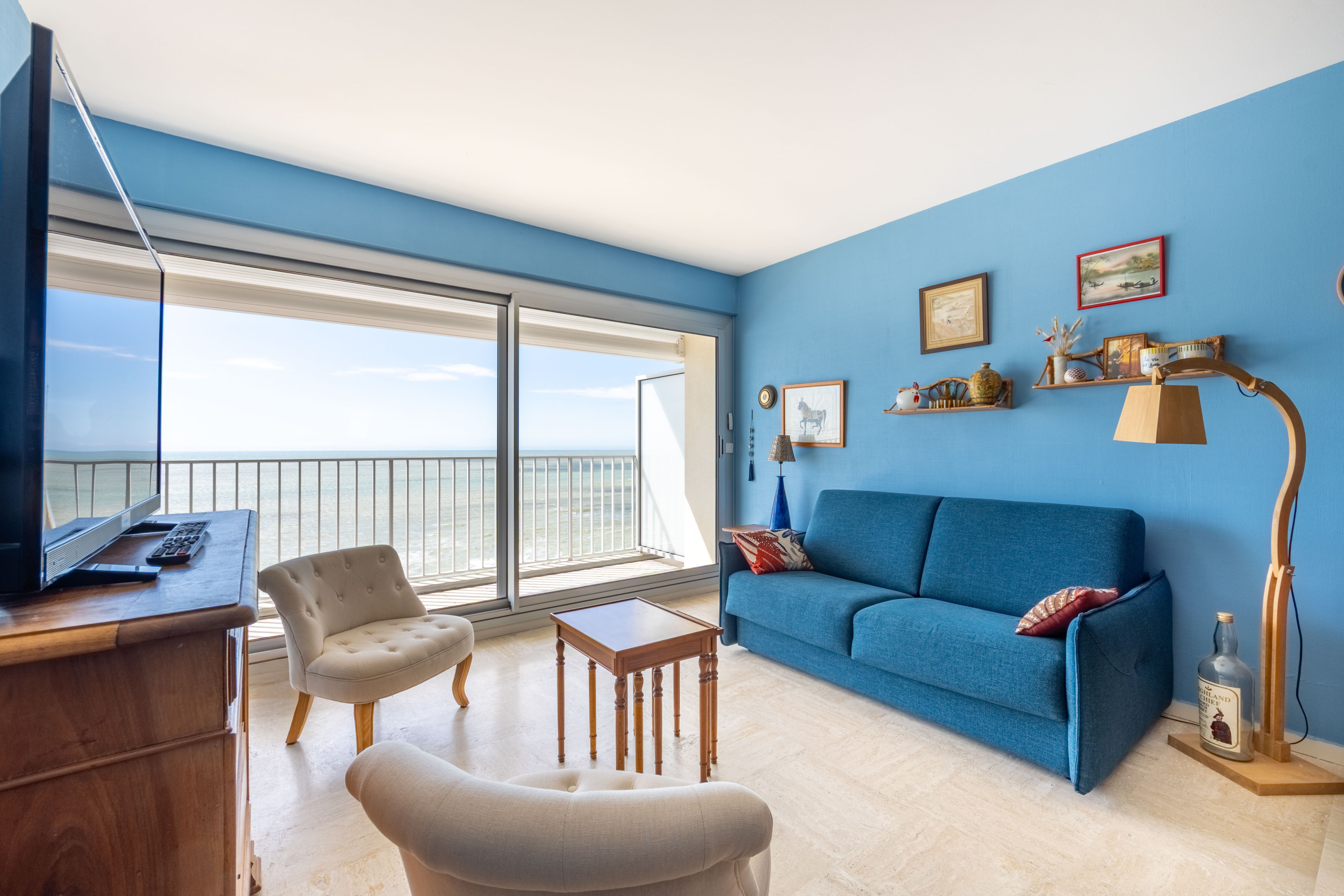 🔹 Séjour spacieux avec vue mer, canapé convertible et accès au balcon