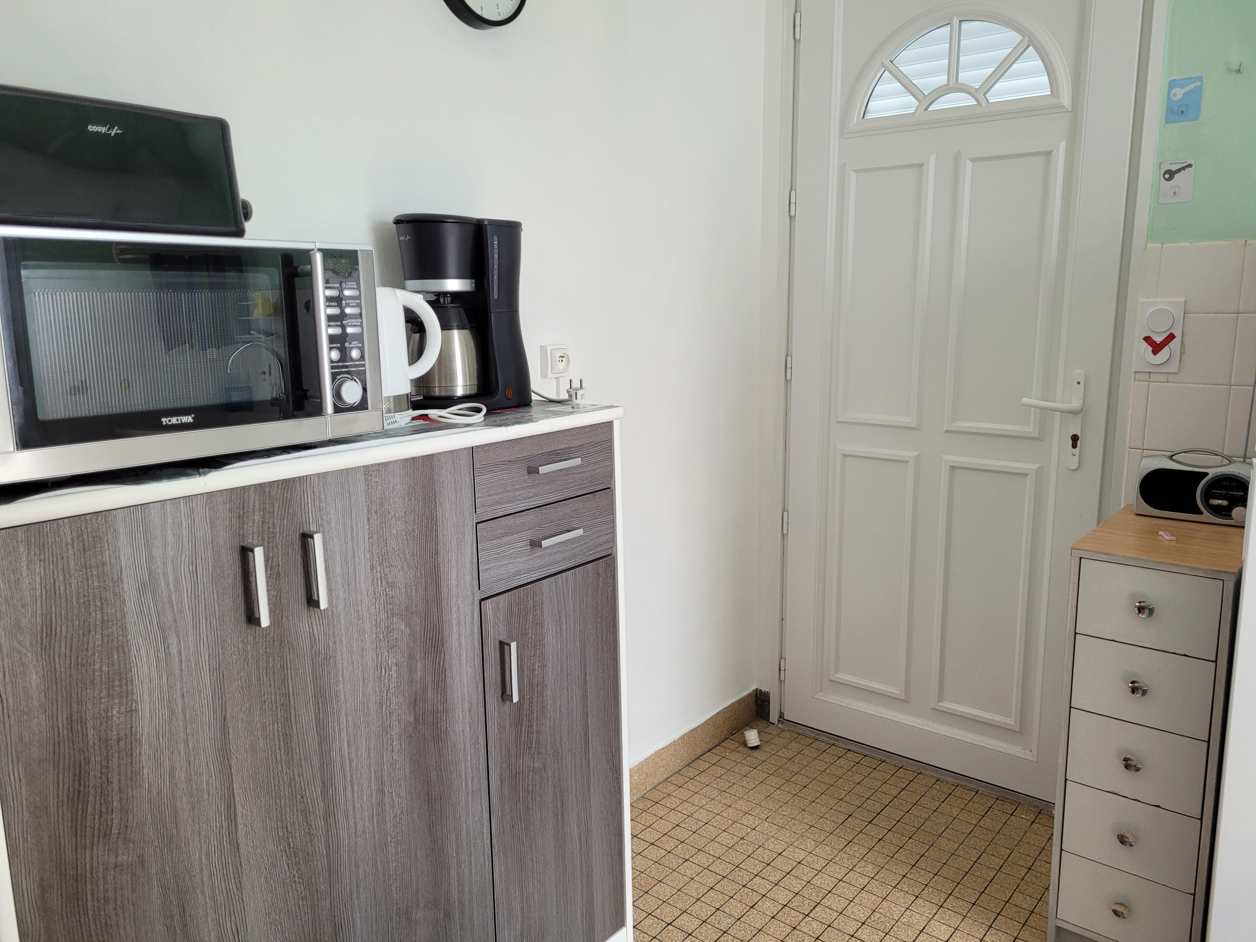 Cuisine : plaques, réfrigérateur, micro-ondes, cafetière à filtre, bouilloire et grille pain.