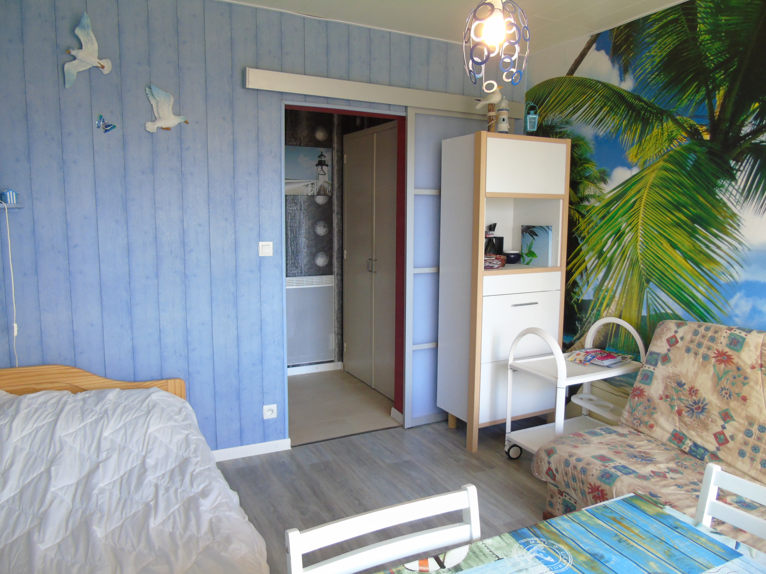 Séjour : Table - chaises - canapé convertible - 1 lit gigogne 2 x 90 cm - rangements - TV.
