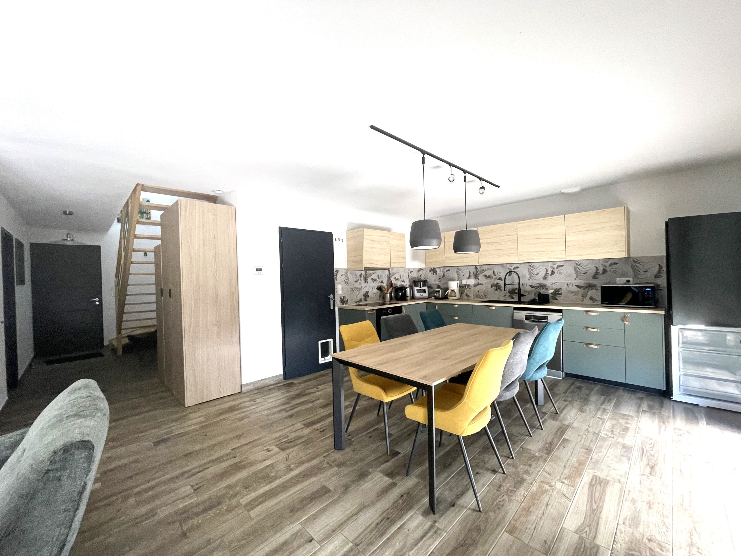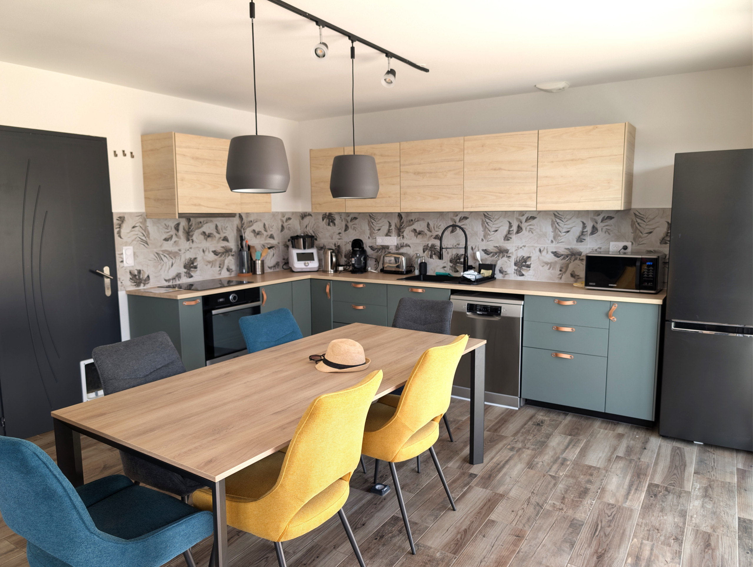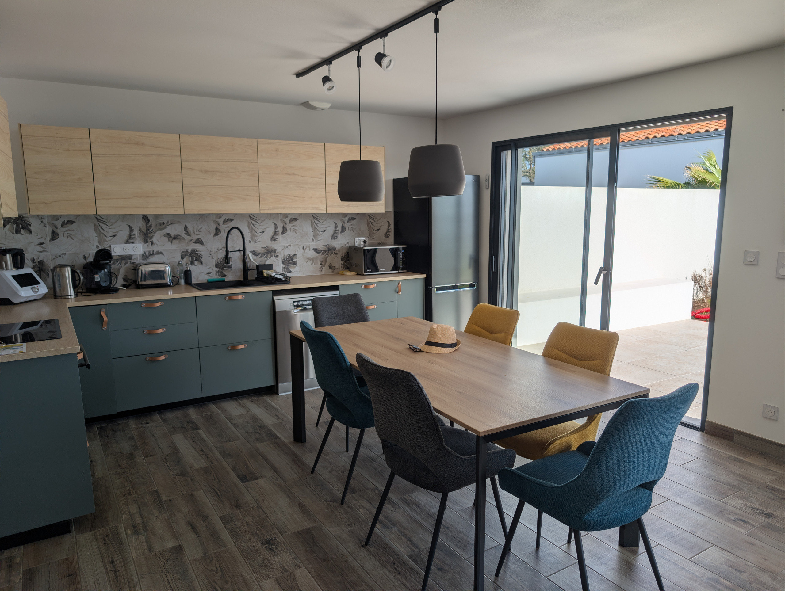 La maison dispose d’une belle et grande pièce de vie lumineuse, conviviale et confortable, comprenant un coin salon et une cuisine entièrement équipée et aménagée. Cet espace s’ouvre directement sur une agréable terrasse, idéale pour profiter des beaux jours, avec mobilier de jardin et barbecue pour partager de bons moments en extérieur.