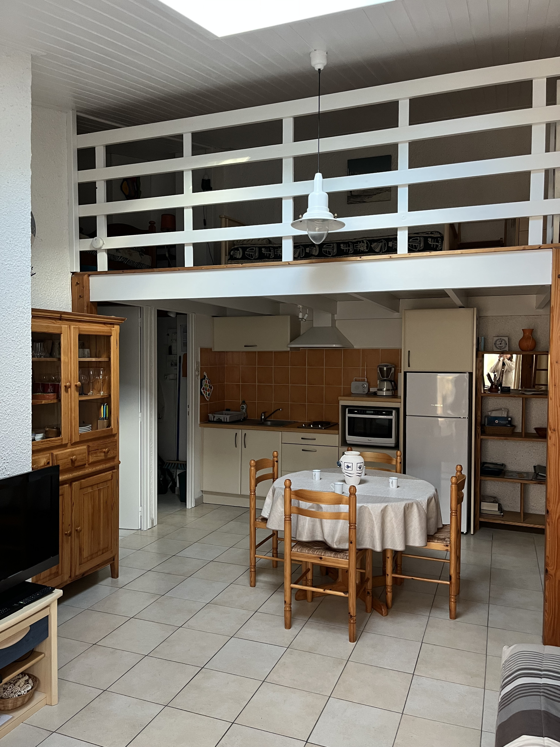 Cuisine : Evier - 2 plaques électrique - micro-ondes mixte - réfrigérateur congélateur.