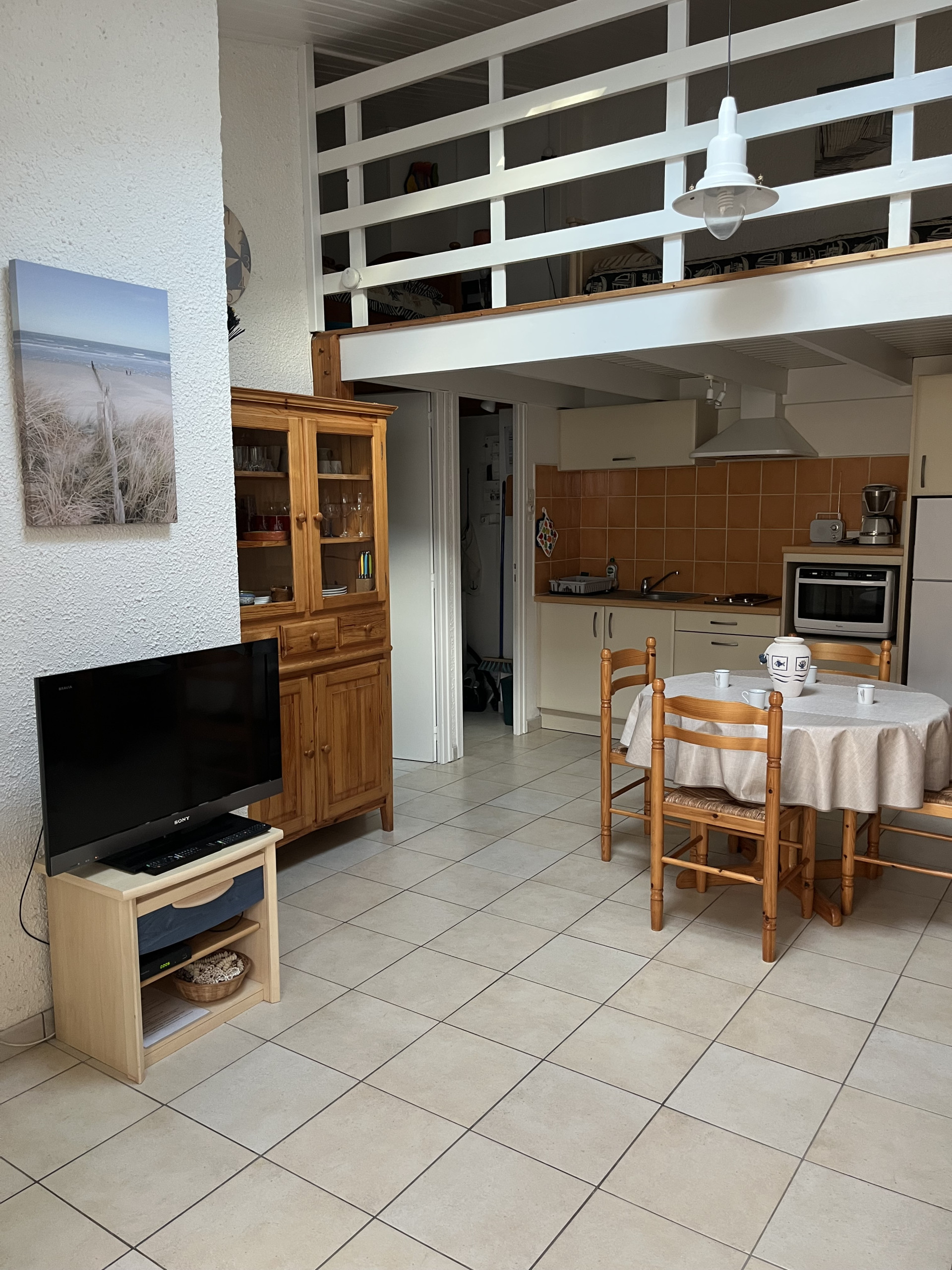 Cuisine/séjour : four, plaques inductions, micro-ondes, lave-vaisselle, réfrigérateur, cafetière a filtre, congélateur, évier, table chaises, buffet, canapé, table de salon, TV.