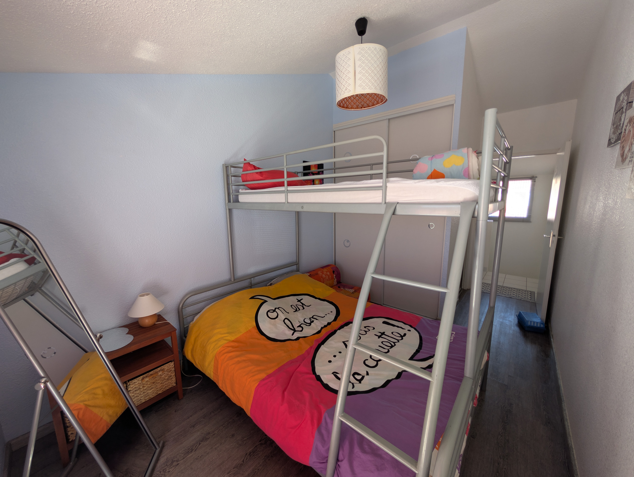 A l'étage: une seconde chambre avec lits superposés ( 1 lit double + 1 lit individuel). Une seconde salle d'eau.