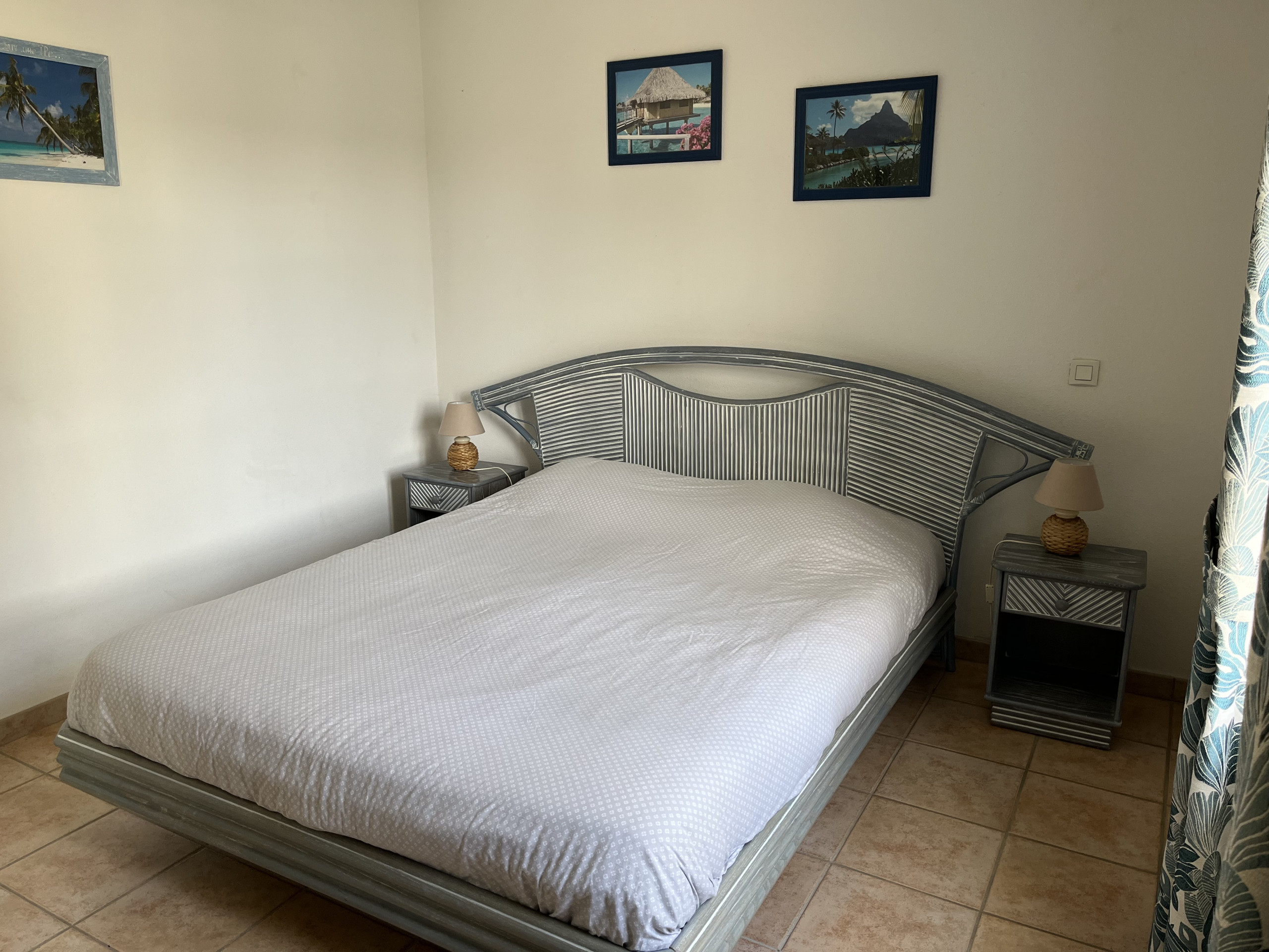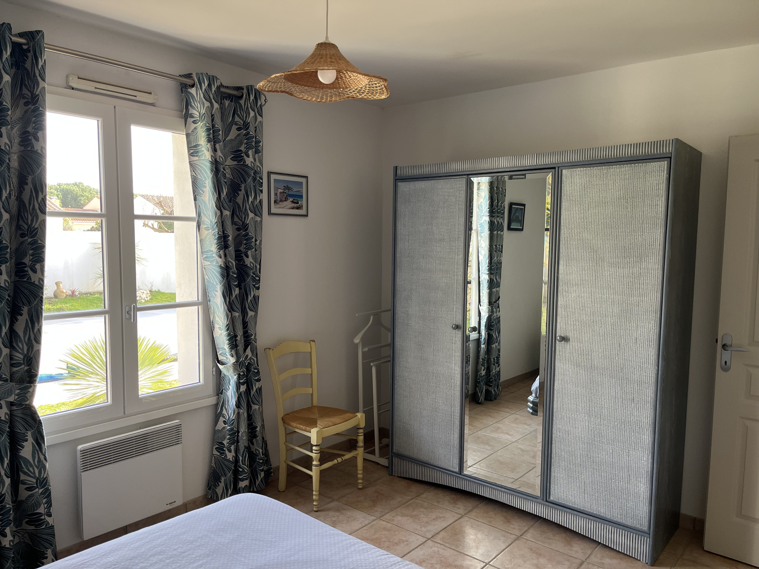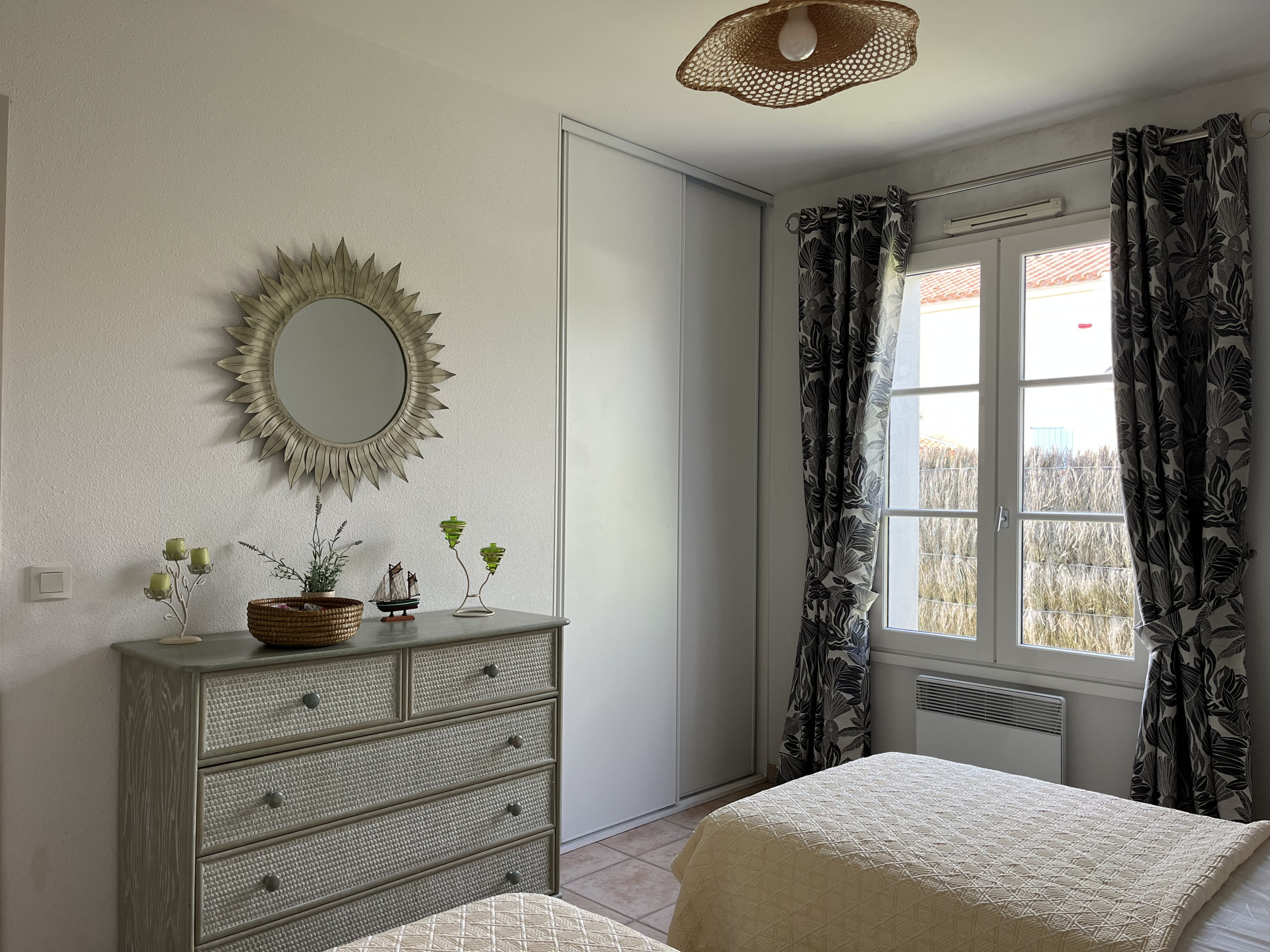 Chambre 2 : lit double 140cm, armoire, 2 chevets, chaise.
