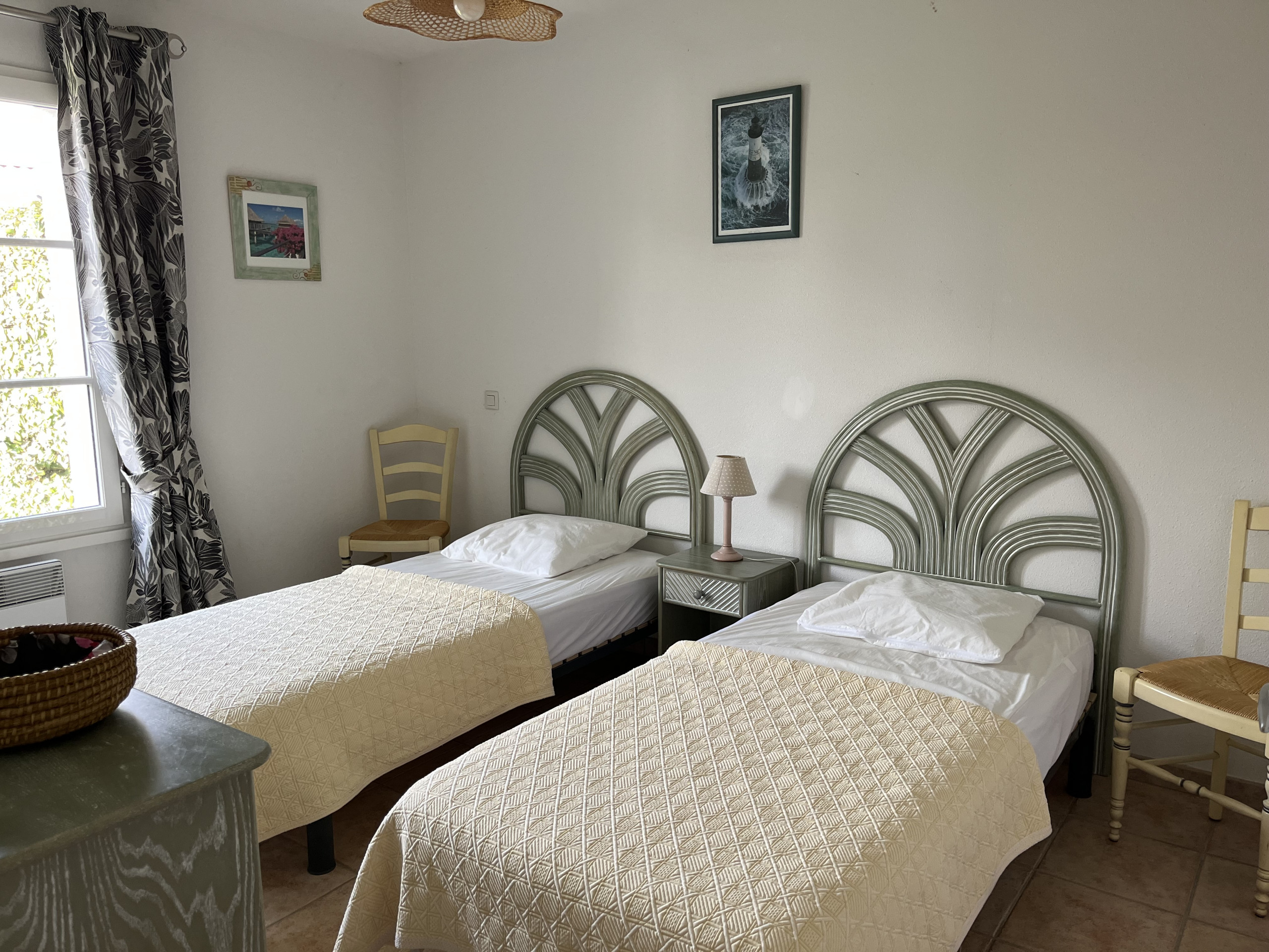 Chambre : 2 lits 90cm, chevet, placard et commode, 2 chaises.