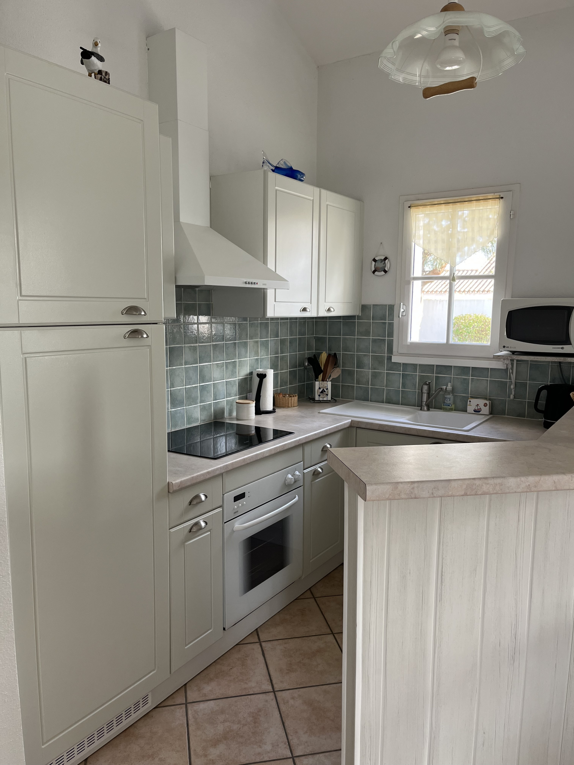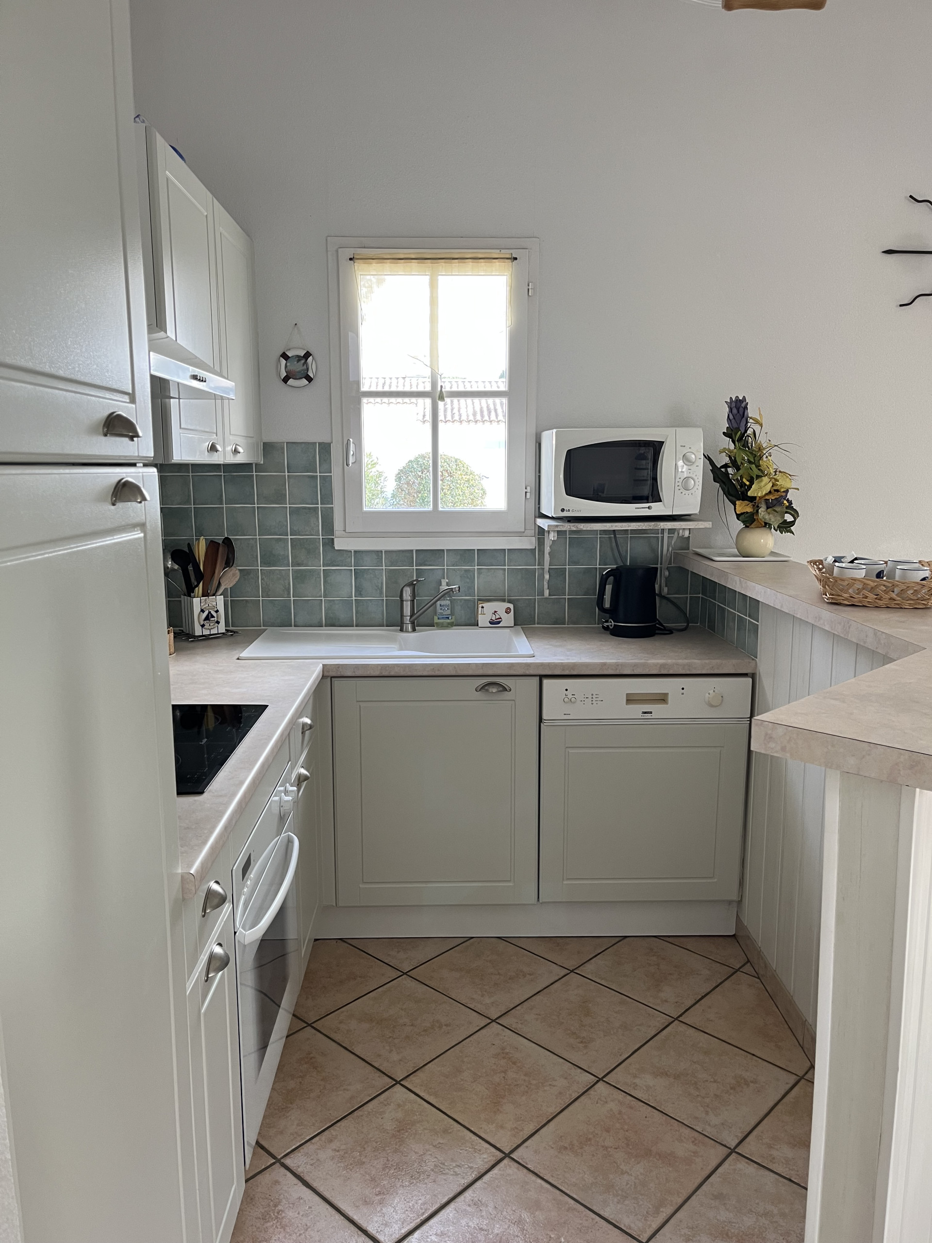 Cuisine : Placards, évier, four, 4 feux induction, hotte aspirante, micro-ondes, réfrigérateur, congélateur, lave-vaisselle, cafetière, bouilloire,