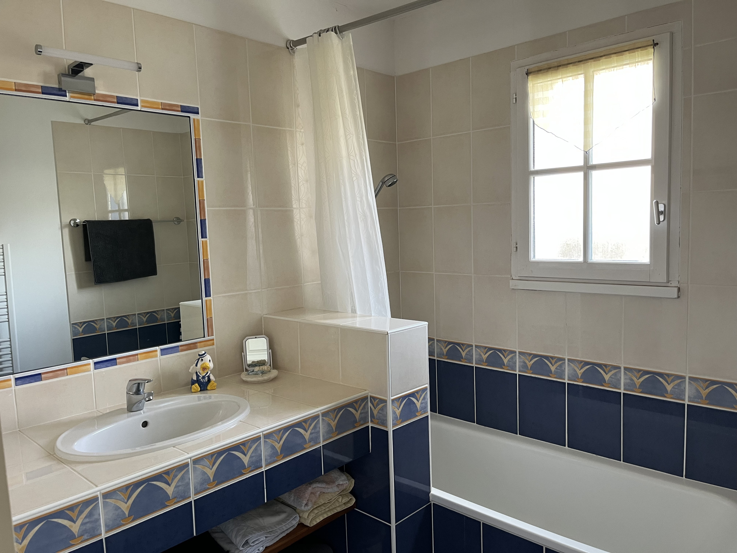 Salle de bains : baignoire, meuble simple vasque, sèche serviette.