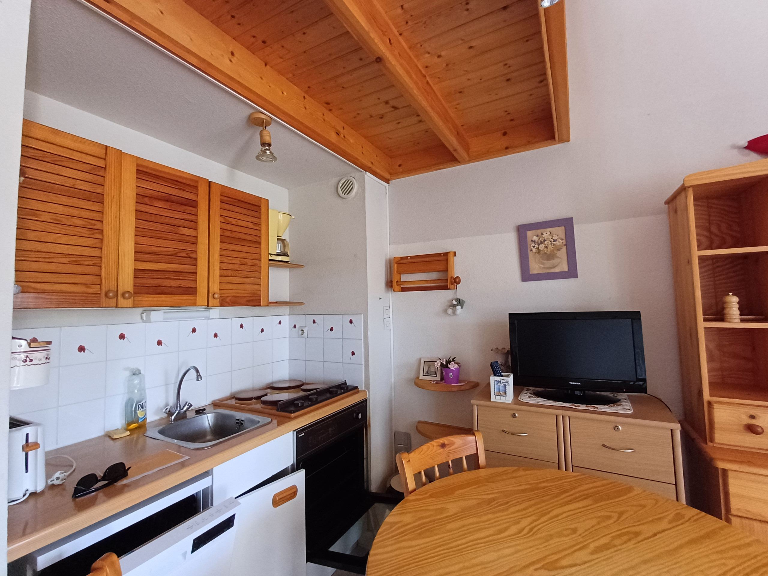 Cuisine : Plaques de cuisson, réfrigérateur, placards, four, micro-ondes, lave-vaisselle.